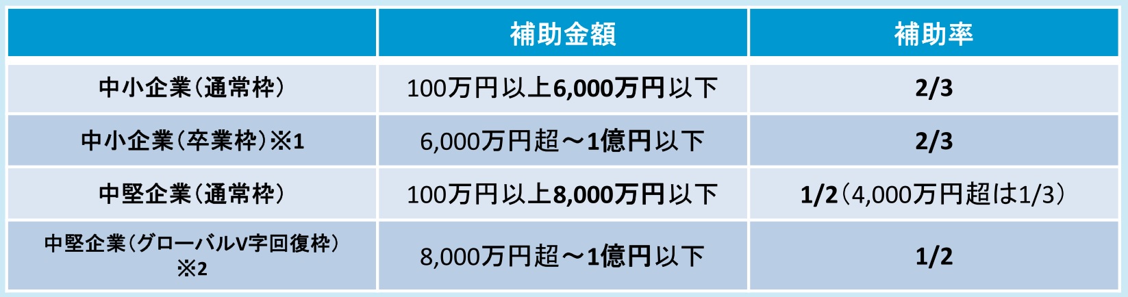 ※2.中堅企業(グローバルV字回復枠):100社限定。以下の要件を全て満たす中堅企業向けの特別枠。